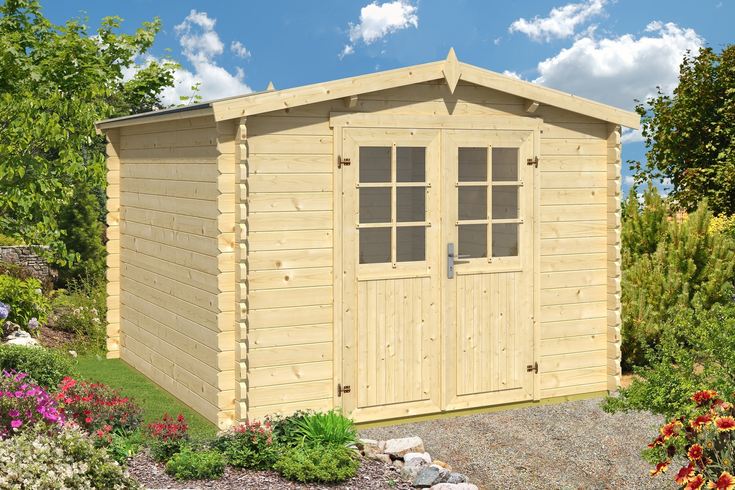 Casetta realizzata esclusivamente con legno di abete nordico non impregnato. Il legno nordico di alta qualità, unitamente allo spessore da 34 mm delle pareti, permette una longevità della casetta fuori dal comune. Dotata di doppia porta finestrata con maniglia e serratura e cerniere registrabili, è molto comoda per riporre oggetti ingombranti. Con pratico scalino ribassato sull`entrata.